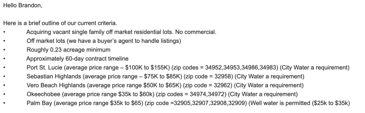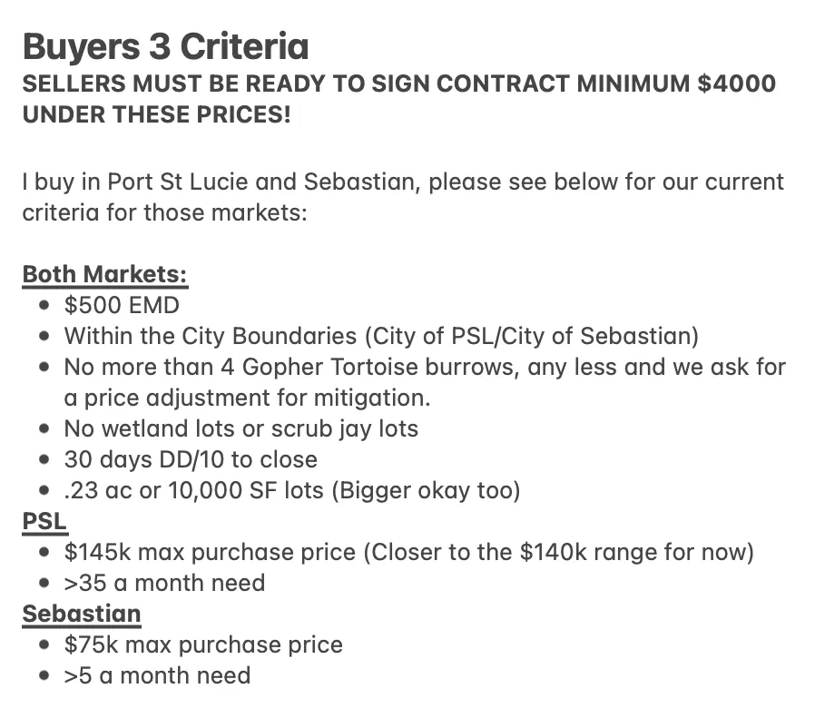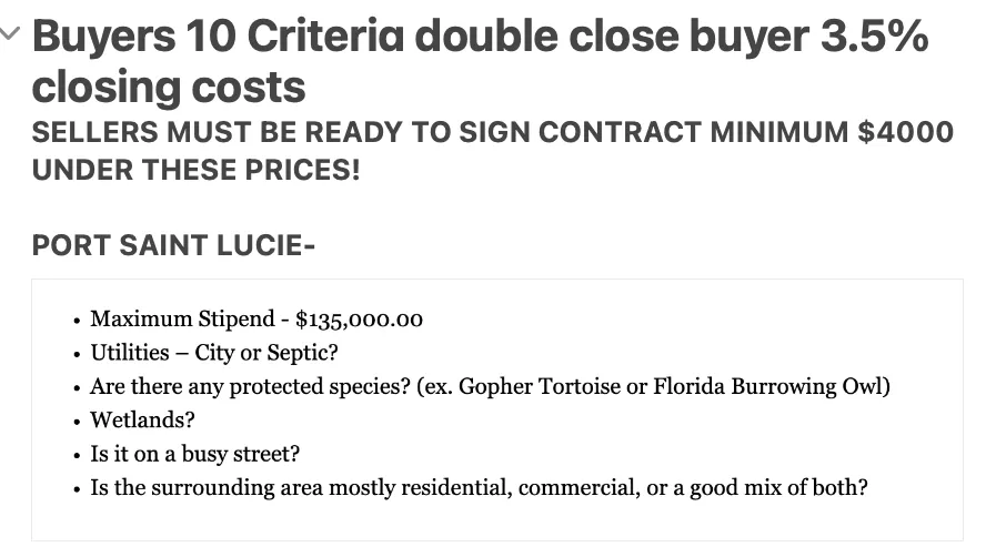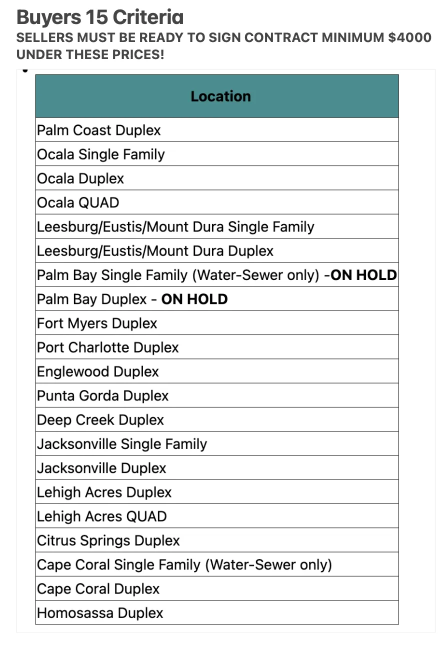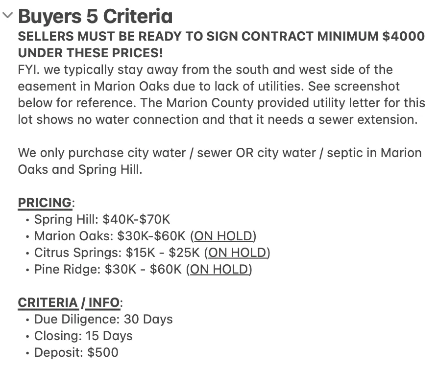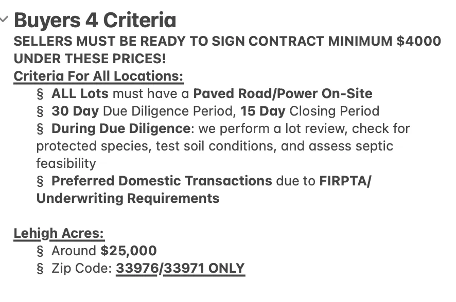 DEAL MUST BE UNDER CONTRACT. After review, if accepted, we will send them a new agreement under my company. Now If you have been talking to a seller who is ready to sign at a price below my buyers criteria, that will also work. Submit the deal!
